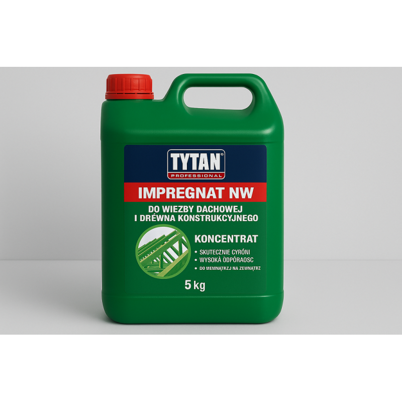 TYTAN PROFESSIONAL Impregnat NW to wysokiej jakości koncentrat do impregnacji dachów i drewna konstrukcyjnego. Produkt o pojemności 5 kg w kolorze zielonym doskonale chroni przed wilgocią, grzybami i szkodliwym działaniem warunków atmosferycznych. Dzięki specjalnej formule impregnat szybko się wchłania i skutecznie zabezpiecza powierzchnię. Idealny do zastosowania na tarasach, ogrodowych meblach czy płotach. TYTAN PROFESSIONAL Impregnat NW to gwarancja trwałej ochrony i pięknego wyglądu drewnianych elementów.